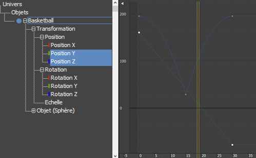 La balle rebondit comme auparavant, mais à chaque reprise du rebond, le mouvement vers l'avant recommence à l'endroit où il s'est terminé. Vous pouvez voir la différence dans l'éditeur de courbes, si vous effectuez un zoom arrière dans la fenêtre de la courbe : la piste Position Z monte et descend, mais la piste Position Y continue sur une ligne droite.