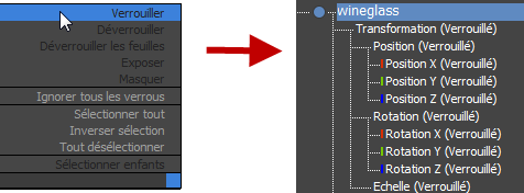 Lorsque la règle Objets non verrouillés est appliquée, vous pouvez utiliser les quatre icônes au bas du panneau déroulant Règles pour verrouiller rapidement tous les modificateurs, matériaux, transformations et objets, mais également utiliser le bouton Editer pour verrouiller des pistes spécifiques, comme précédemment. Pour des raisons pratiques, dans cet exercice, vous utiliserez uniquement les pistes de transformation verrouillées existantes du verre à vin.