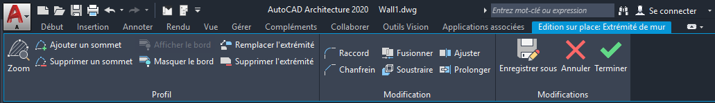 Plusieurs entités d'édition sur place sont parfois créées dans une session unique. Par exemple dans le cas des murs comprenant plusieurs profils de coupe ou modificateurs ou dans le cas des dalles et des dalles de toit comprenant un profil de rive et de sous-face. Vous pouvez tous les modifier au cours de la session. Lorsque vous quittez le mode d'édition sur place, toutes les modifications peuvent être ignorées ou enregistrées.
