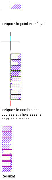 Cette procédure permet d'insérer les composants de détail devant être reproduits plusieurs fois sous forme de réseau linéaire (comme les briques d'une construction, par exemple). Dans cet exemple, la propriété de la vue choisie pour l'outil d'insertion de briques correspond à une vue en coupe. Les messages d'invite sont les mêmes pour une vue en plan. Si le paramètre de vue choisi est Elévation, les messages d'invite affichés sont décrits dans la rubrique Pour insérer des composants d'invite. Si le paramètre de vue choisi est Elévation (Motif), les messages d'invite affichés sont décrits dans la rubrique Pour insérer des composants de remplissage.