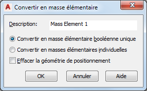 - Pour convertir l'ensemble des objets sélectionnés en une seule masse élémentaire, sélectionnez l'option Convertir en masse élémentaire booléenne unique.