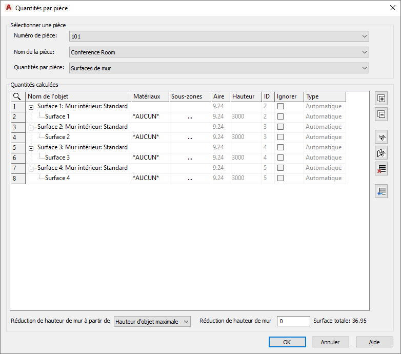 - Dans la zone Sélectionner une pièce de la boîte de dialogue Quantités par pièce, sélectionnez Surfaces de mur dans la liste Quantités par pièce.