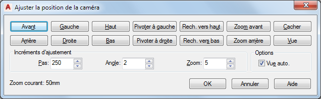 Chaque fois que vous cliquez sur un bouton, la vue change en fonction des valeurs indiquées dans la section Incréments d'ajustement. Si la case à cocher Vue auto. est activée, vous pouvez visualiser la modification après avoir cliqué sur le bouton. Si elle est désactivée, cliquez sur Vue pour visualiser les changements.