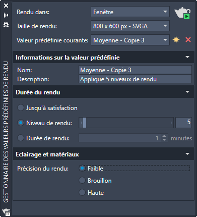 Affiche le nom et la description de la valeur prédéfinie de rendu sélectionnée.