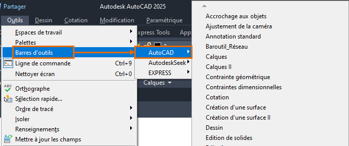 Remarque : Assurez-vous qu'un dessin est ouvert pour que le menu Outils soit inclus.