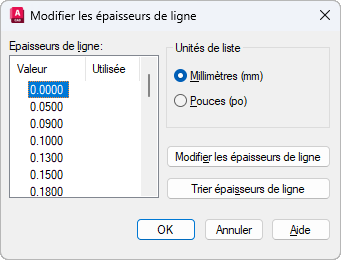 Trie la liste des épaisseurs de ligne par valeur. Si vous modifiez les valeurs des épaisseurs de ligne, choisissez Trier les épaisseurs de ligne pour trier à nouveau la liste.