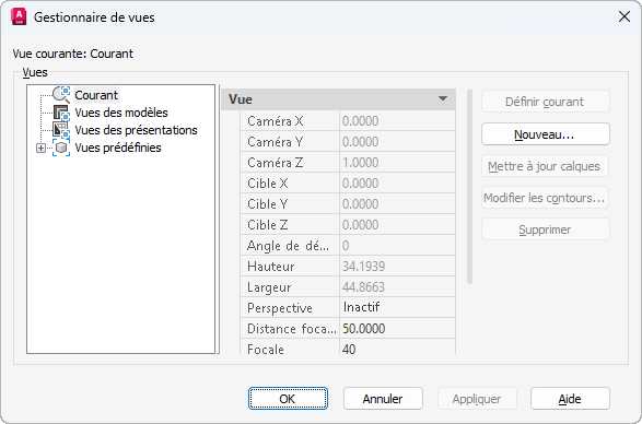 • Courant. Affiche la vue courante et ses propriétés Vue et Délimitation.