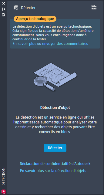 La palette Détection propose des options permettant d’analyser votre dessin et de vérifier les objets identifiés pour la conversion de blocs.
