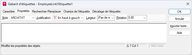 Applique un style de texte à l'étiquette. Le style courant est enregistré dans la variable système TEXTSTYLE. L'application d'un nouveau style à un gabarit d'étiquettes existant écrase la police, la hauteur et les attributs Gras ou Italique du formatage des caractères. Les attributs d'empilage, de soulignement et de couleur sont conservés dans les caractères auxquels un nouveau style est appliqué. Les styles ayant des effets inversé ou renversé ne sont pas appliqués. Si un style défini avec un effet vertical est appliqué à une police SHX, le texte s'affiche horizontalement dans la boîte de dialogue Gabarit d'étiquettes.
