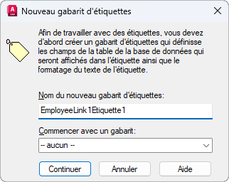 Les étiquettes sont des objets texte multiligne qui affichent les données dans un dessin à partir de champs sélectionnés et enregistrés dans des tables de bases données externes. Les étiquettes peuvent être autonomes ou associées à un objet.