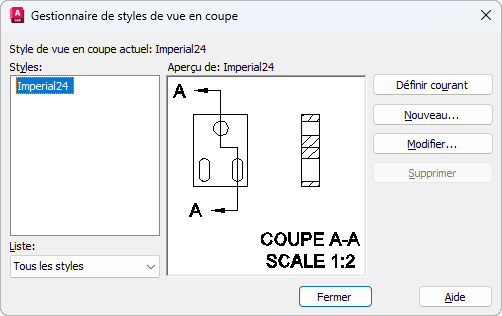 Affiche une liste des styles de vue en coupe disponibles dans le fichier de dessin courant. Le style courant est en surbrillance.