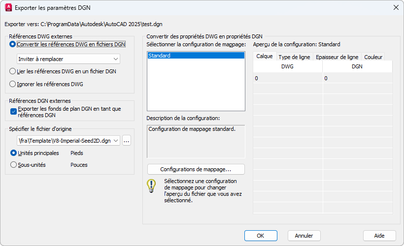 Standard est la configuration de mappage par défaut qui extrait des données du dessin exporté et applique un mappage automatique aux calques DGN, types de ligne, épaisseurs de ligne et couleurs, tels qu'ils apparaissent dans l'aperçu de mappage.