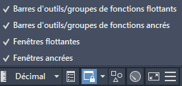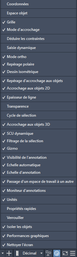 La barre d'état permet d'accéder rapidement à des outils ayant une incidence sur l'environnement de dessin.