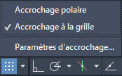 Trouver | Mode d'accrochage | Active l'accrochage à la grille. Lorsque l'accrochage à la grille est activé, le curseur s'accroche aux intervalles de grille indiqués lorsque vous le déplacez. Lorsque l'accrochage polaire est activé, le curseur s'accroche à des distances spécifiques le long des trajectoires d'alignement polaires indiquées. |