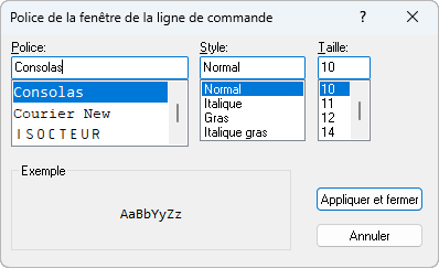La police du texte utilisée dans la fenêtre de commande peut être modifiée en fonction de vos préférences.