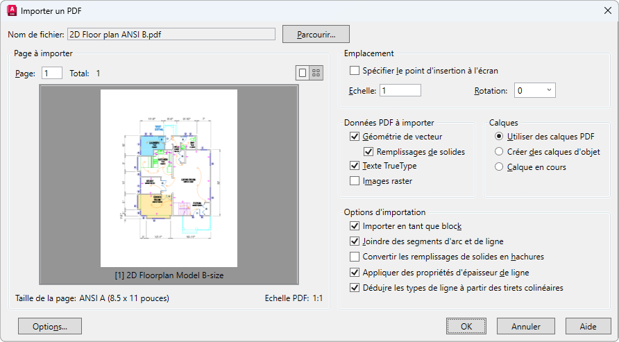 Crée des calques AutoCAD pour tous les types d'objets généraux suivants, importés depuis le fichier PDF : PDF_Geometry, PDF_Solid Fills, PDF_Images et PDF_Text.