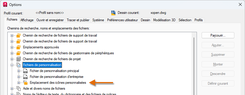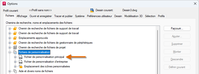 Les fichiers de personnalisation (CUI / CUIx) définissent des éléments de l'interface utilisateur, tels que la barre d'outils d'accès rapide (QAT), des groupes de fonctions et des onglets du ruban, des palettes, des barres d'outils classiques et des menus déroulants. En fonction de la version à partir de laquelle vous effectuez la migration, l'utilitaire Migrer les paramètres personnalisés cherche le fichier CUI ou CUIx spécifié par le paramètre Fichier de personnalisation principal. Le fichier de personnalisation principal est migré en plus des fichiers de personnalisation partiels chargés dans le fichier CUI / CUIx.