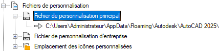- Dans l'Explorateur de fichiers, accédez à l'emplacement suivant : <lecteur>:\Users\<nom du profil utilisateur>\AppData\Roaming\Autodesk\<nom du produit>\<numéro de version>\<langue>\support\<nom du fichier de personnalisation>.cuix.