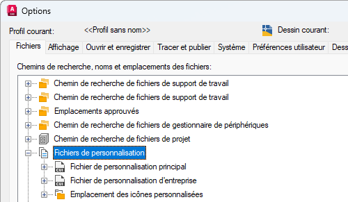 - Dans l'onglet Fichiers de la boîte de dialogue Options, cliquez sur le signe plus (+) situé à côté de Fichiers de personnalisation pour développer le noeud.
