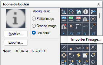 - Dans le volet Icône de bouton, cliquez avec le bouton droit de la souris sur la liste des images et choisissez Importer l'image.