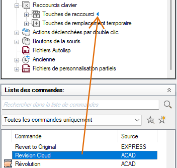 • Pour créer une touche de raccourci, dans le volet Liste des commandes, faites glisser la commande vers le noeud Touches de raccourci du volet Personnalisations dans <nom de fichier>.