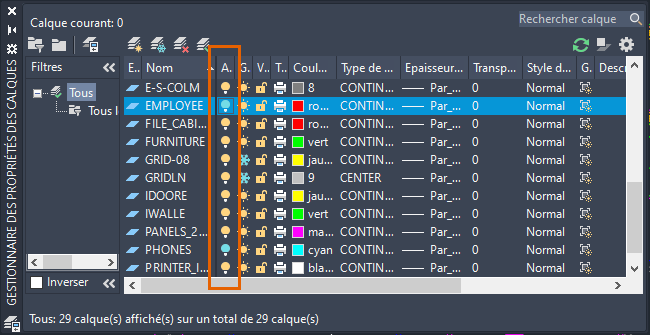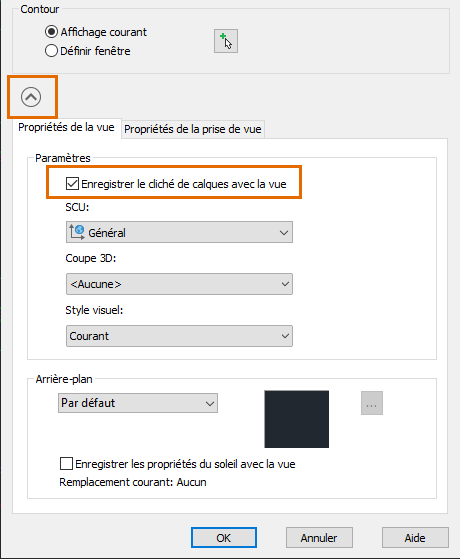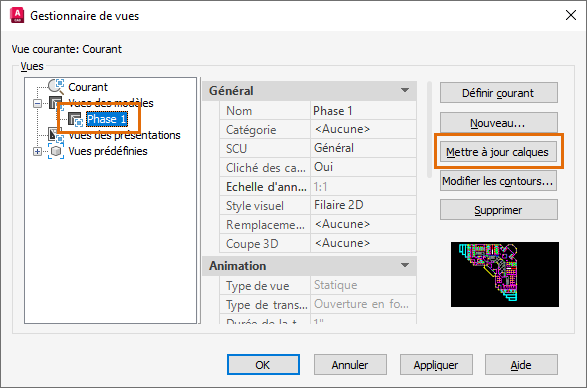 Elle permet d’enregistrer et de restaurer les paramètres de visibilité des calques avec la vue existante. Les paramètres de visibilité des calques enregistrés dans la vue existante incluent les paramètres Actif/Inactif et Libérer/Geler, mais pas les paramètres Verrouillé/Déverrouillé.
