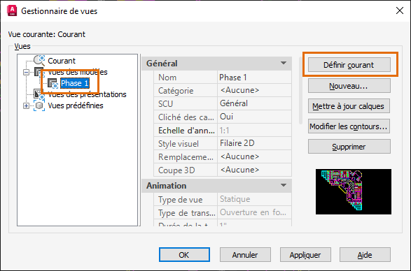 Sélectionnez le nom de la vue, cliquez sur Définir courant, puis sur OK.