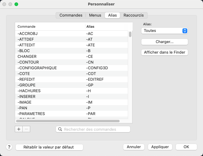 Remarque : Les modifications apportées aux alias de commande sont enregistrées dans le fichier acaduser.pgp (ou acadltuser.pgp pour AutoCAD LT).