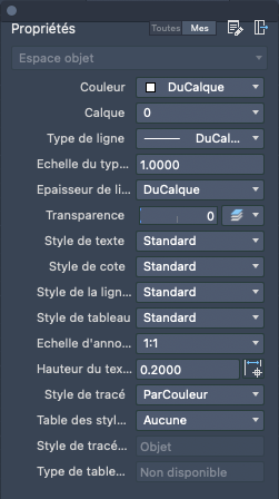 Affiche les propriétés pour le dessin courant ou les objets sélectionnés.
