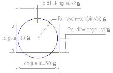 Les formules et les équations peuvent être représentées par des expressions au sein des paramètres de contraintes dimensionnelles ou en définissant des variables utilisateur. Par exemple, l'illustration suivante représente une conception qui contraint un cercle au centre du rectangle, dont l'aire est égale à celle du rectangle.