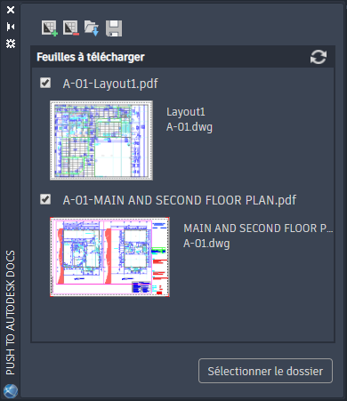 PUSHTODOCSOUVRIR : ouvre la palette Push to Autodesk Docs, qui permet de sélectionner les présentations AutoCAD à charger en tant que fichiers PDF vers Autodesk Docs.