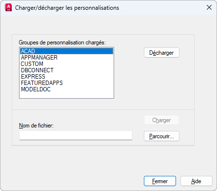 Boîte de dialogue Charger/Décharger les personnalisations