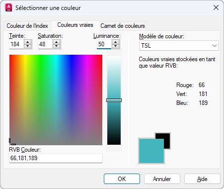 Spécifie le modèle de couleurs RVB pour la sélection des couleurs. Les options disponibles dans l'onglet Couleurs vraies dépendent du modèle de couleurs indiqué : TSL ou RVB.