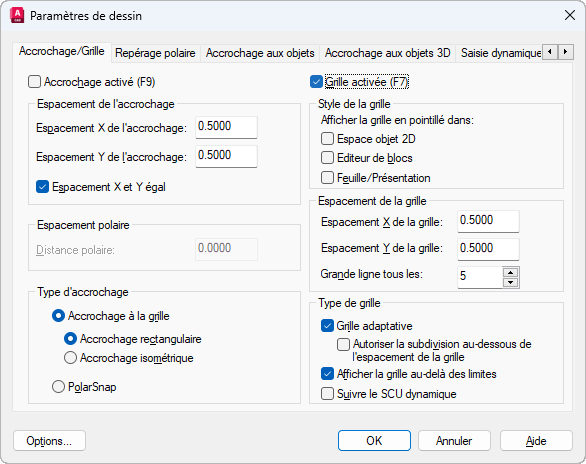 Contrôle une grille rectangulaire invisible d'emplacements d'accrochage qui restreint le mouvement du curseur selon les intervalles X et Y spécifiés.
