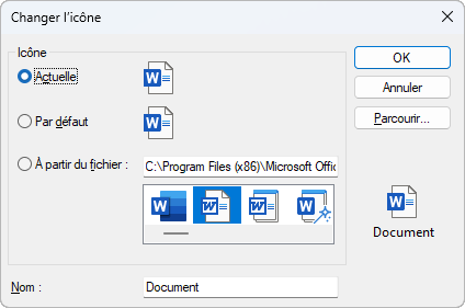 Affiche la boîte de dialogue Parcourir (boîte de dialogue standard de sélection de fichiers), qui permet de sélectionner une icône à partir d'un fichier.