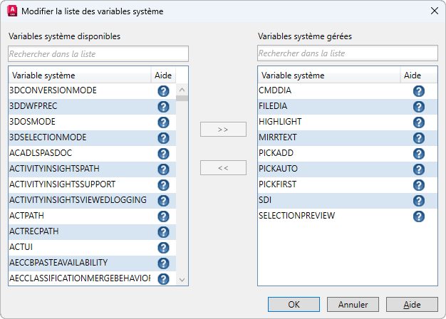 Répertorie toutes les variables système disponibles pouvant être contrôlées. Entrez une chaîne dans la zone de recherche pour rechercher rapidement une variable système.