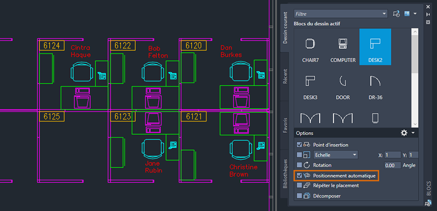 Le positionnement automatique des blocs vous permet d'insérer facilement des blocs à l'aide de la palette Blocs, en fournissant des suggestions basées sur une géométrie similaire et des motifs appris à partir d'occurrences de blocs précédentes dans votre dessin.