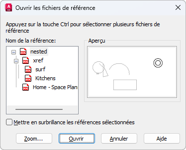 Ferme temporairement la boîte de dialogue Ouvrir les fichiers de référence et effectue un zoom de la vue dans la zone de dessin sur la référence sélectionnée. Appuyez sur Entrée pour afficher de nouveau la boîte de dialogue.