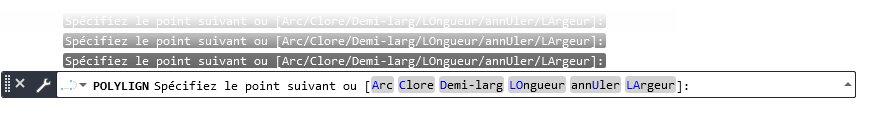 Par défaut, la fenêtre de commande affiche une seule ligne d'invite. Un historique temporaire des invites s'affiche au-dessus de la fenêtre de commande lorsqu'une commande est en cours d'exécution. Cette méthode permet de modifier le nombre maximal de lignes affichées dans l'historique des invites d'une commande unique comportant plusieurs points ou options, telles que POLYLIGN.