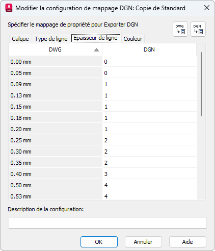 Un jeu prédéfini d'épaisseurs de ligne est affiché. Celui-ci indique la meilleure correspondance entre les épaisseurs de ligne utilisées dans les fichiers DGN et DWG. Vous pouvez copier et coller une ou plusieurs épaisseurs de ligne à l'aide du menu contextuel (clic droit) de la colonne de droite. Vous ne pouvez modifier que la colonne de droite de l'onglet Epaisseur de ligne. La colonne de gauche n'est pas modifiable.