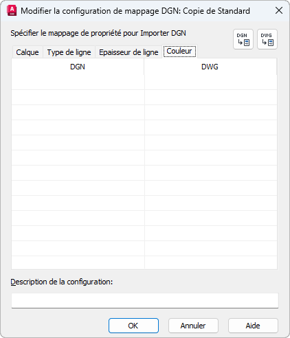 Configuration de mappage existante : si vous êtes en train de modifier une configuration de mappage (même si vous modifiez une configuration autre que Standard à partir de la boîte de dialogue Importer (ou Exporter) les paramètres DGN), les propriétés affichées dans la table de mappage ne sont pas dérivées du fichier DGN importé ou du fichier dessin exporté.
