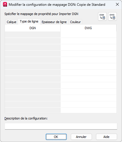 Exportation d'une configuration de mappage :si vous avez accédé à la boîte de dialogue Modifier la configuration de mappage DGN en créant une configuration à partir de la boîte de dialogue Exporter les paramètres DGN, la liste DWG intègre alors tous les types de ligne définis dans le fichier de dessin courant. Lorsque la cellule cible est vide (colonne de droite), le mappage système par défaut est utilisé.