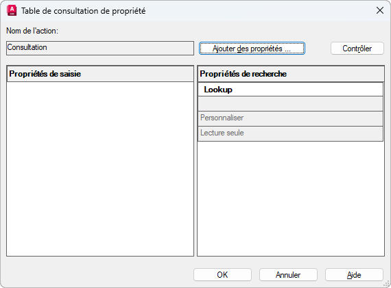 Affiche la valeur personnalisée affectée aux propriétés de saisie. Cliquez sur le bas d'une colonne de consultation pour mettre la propriété de consultation en lecture seule ou autoriser la consultation inversée. L'option Autoriser la consultation inversée active une liste déroulante associée à la poignée de consultation qui modifie la référence de bloc d'après les valeurs de propriétés de saisie dans la table.