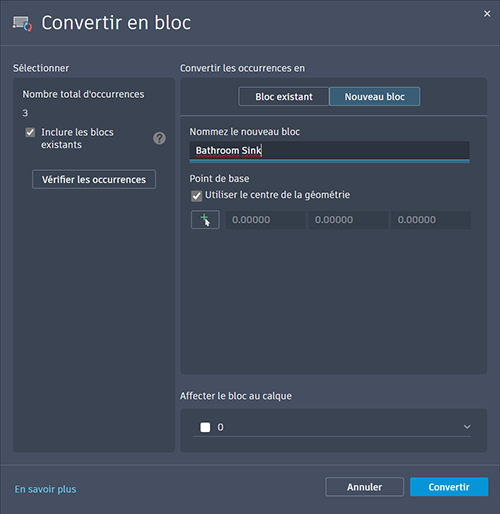 Vous pouvez également convertir l'objet source ou les occurrences sélectionnées en un nouveau bloc. Dans la boîte de dialogue Convertir, définissez un nouveau bloc en indiquant un nom de bloc et un point d’insertion. Par défaut, le point d’insertion est défini sur le centre de la géométrie sélectionnée.