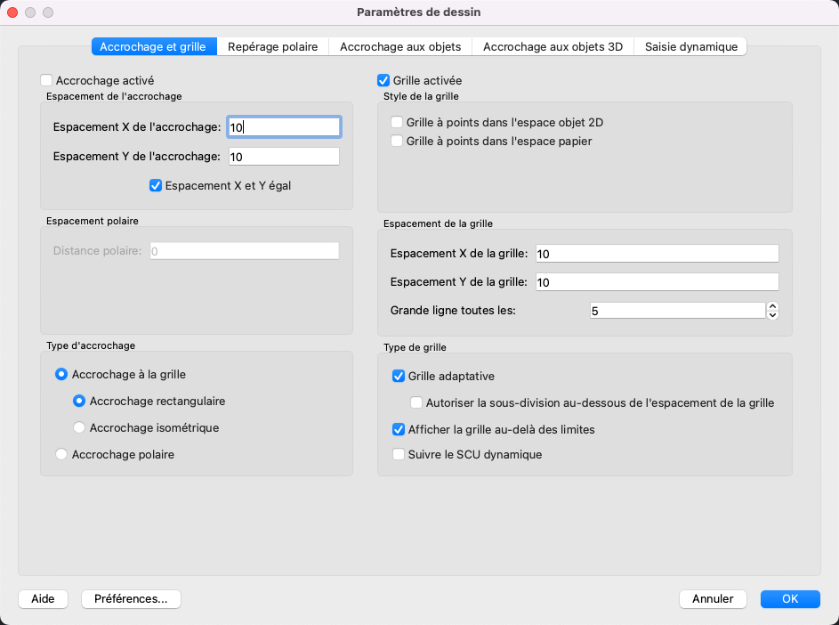 Contrôle une grille rectangulaire invisible d'emplacements d'accrochage qui restreint le mouvement du curseur selon les intervalles X et Y spécifiés.