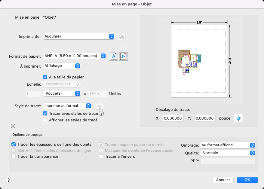 Vous pouvez spécifier un décalage de l'aire du tracé par rapport au coin inférieur gauche de la zone d'impression.