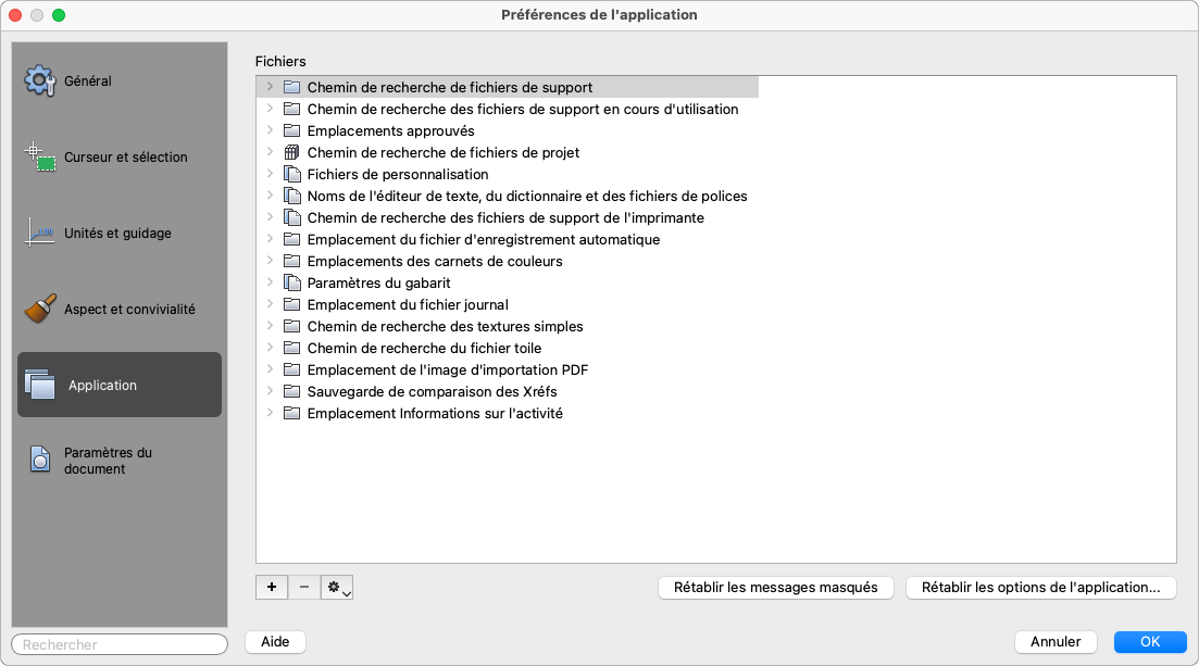 Affiche les répertoires actifs dans lesquels le programme recherche les fichiers de support propres à votre système. Cette liste est en lecture seule et elle répertorie les chemins valables présents dans la structure actuelle du répertoire et la cartographie du réseau.