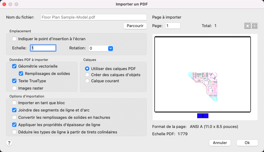 - Crée des calques AutoCAD pour tous les types d'objets généraux suivants, importés depuis le fichier PDF : PDF_Geometry, PDF_Solid Fills, PDF_Images et PDF_Text.