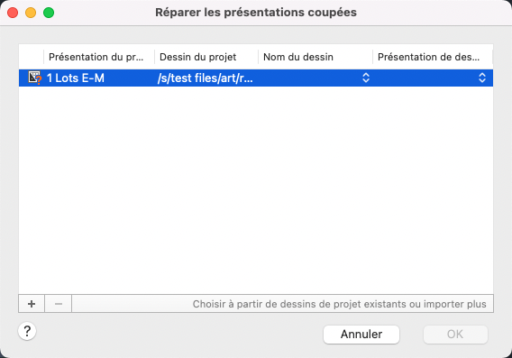 Met à jour l'emplacement des présentations et des fichiers de dessin (DWG) référencés par les présentations de projet dans le projet courant.