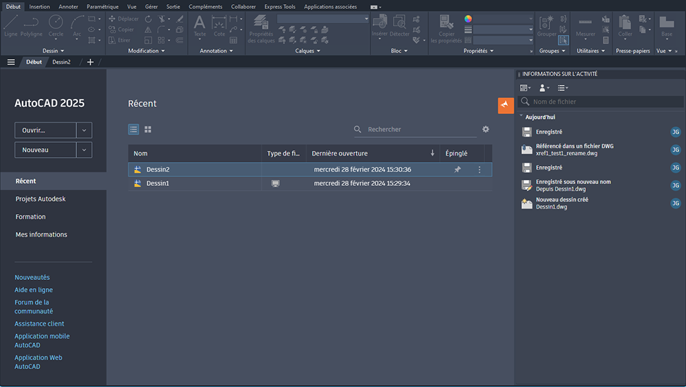 Présentée pour la première fois dans AutoCAD 2024, la palette Informations sur l’activité enregistre désormais d’autres types d’activités et fournit des informations détaillées dans le nouveau groupe de fonctions Propriétés de l’activité.